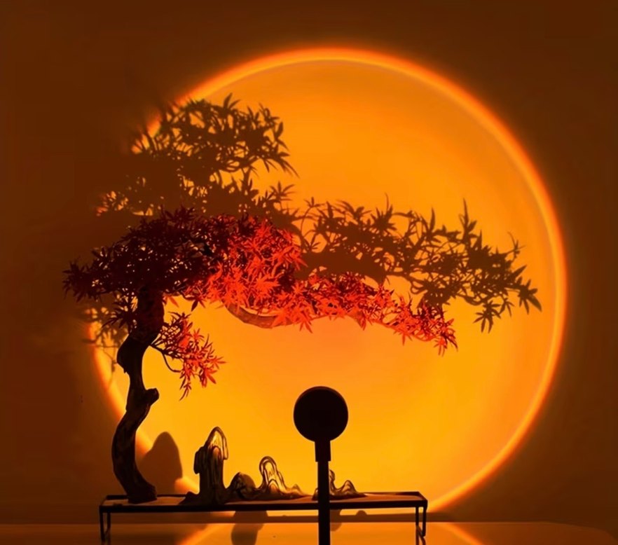 Detaylı ağaç ve dağ silüetleriyle turuncu gölge projektör lamba, sıcak ve canlı bir atmosfer yaratır.