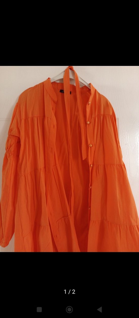 Parlak turuncu renkte, uzun kollu, bol kesim ve bohem tarzda. Düğmeli, desensiz ve akıcı bir yapıya sahip.