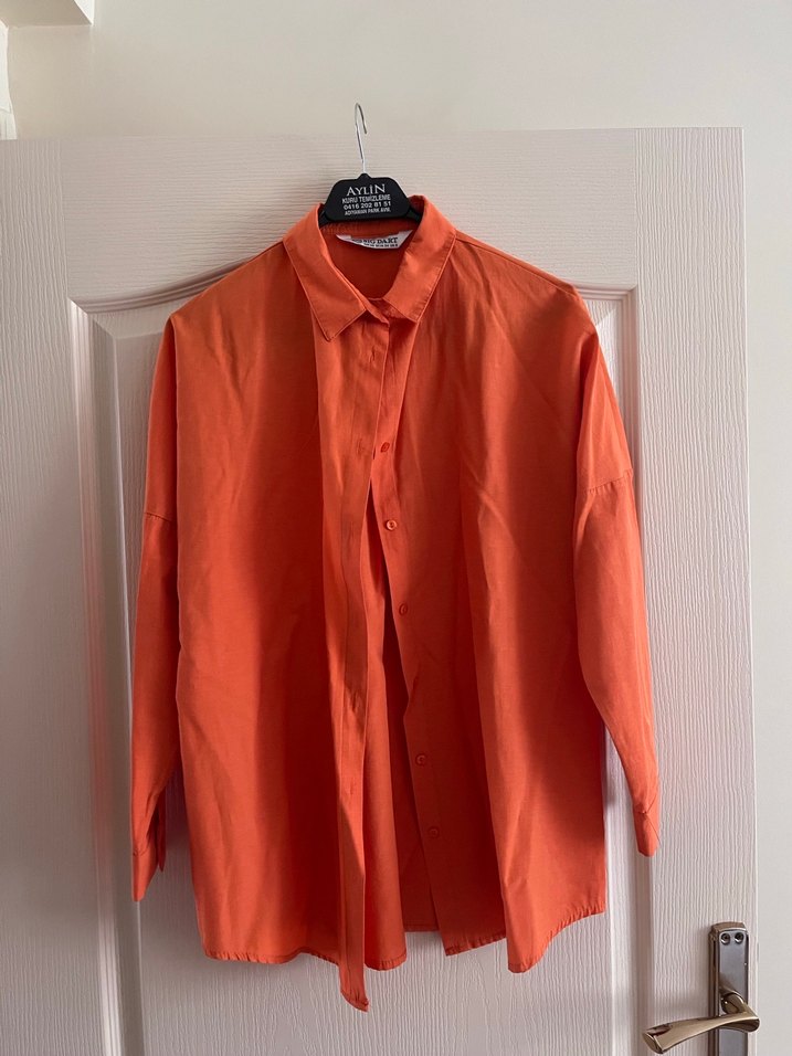 Bol kesim, düğmeli, yakalı kadın gömleği. Yumuşak kumaştan, uzun kollu ve parlak turuncu renkte, gündelik sokak stili için uygun.