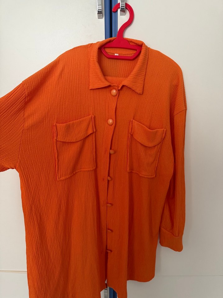 Hiç giyilmedi. defosu yoktur. alt üst takımdır. 42-50 bedene kadar uyumludur. Düğmeli, uzun kollu, yakalı ve iki cepli bol kesim turuncu kadın gömleği. Günlük sokak tarzı için uygundur.