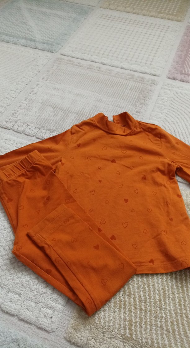 Turuncu renkte, uzun kollu, bisiklet yaka, bol kesim hamile ve emzirme pijama takımı. Normal midi boyda ve kalp desenlidir.