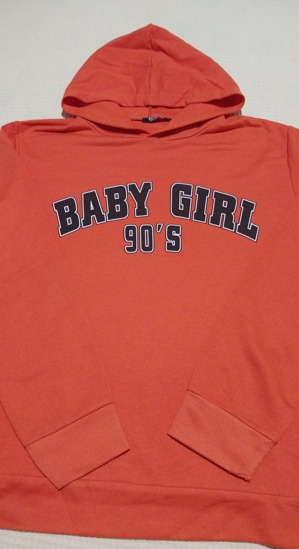 Turuncu renkli, uzun kollu ve yuvarlak yakalı sweatshirt. Bol kesimi ve 'BABY GIRL 90'S' baskısıyla sportif ve rahat şıklık sunar. kollarında deformasyon mevcut