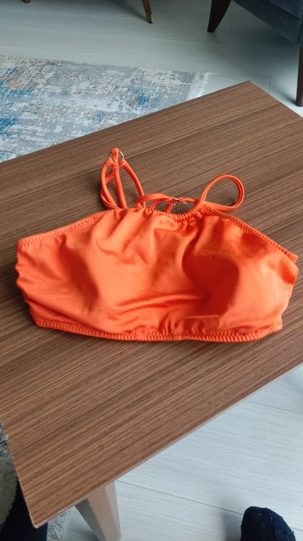 Turuncu renkli, ince askılı ve vücuda oturan bikini üstü, rahat ve şık bir plaj görünümü sunar. ️ ufak tefek renkler mevcuttur.