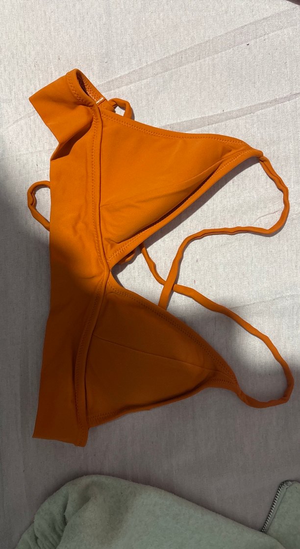 Turuncu, parlak ve ip detaylı, rahat oturan kadın bikini üstü, günlük kullanıma uygun şık tasarım.