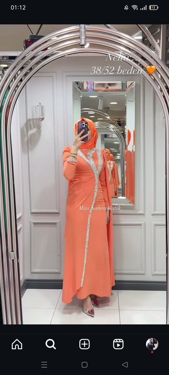 Turuncu işlemeli uzun abiye elbise, yüksek yakalı ve uzun kolludur. Drapeli ve düzenli kesim olup çağdaş stile sahiptir. Düğün için uygundur. ✨