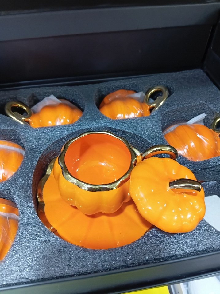 Turuncu porselenden yapılmış, kabak şeklinde ve altın renkli kulplara sahip renkli fincan takımı.