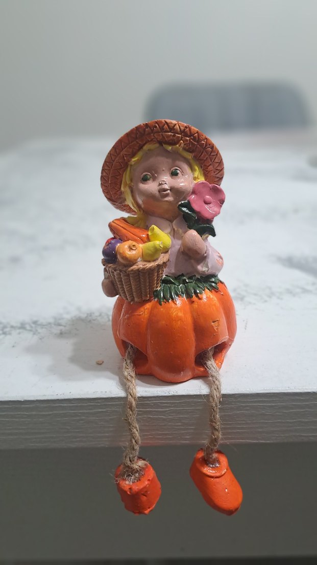 10 cm boyu Turuncu kabak içinde oturan, şapkalı çocuk figürlü, meyve sepeti ve çiçek tutan renkli dekoratif biblo. İp bağlamalı sallanan bacaklar içerir.