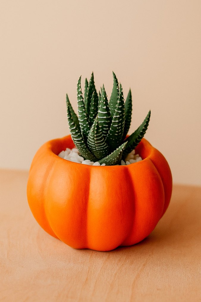 Canlı turuncu kabak şeklinde saksıda beyaz taşlar arasında beyaz çizgili yeşil sukulent bitkisi yer alıyor.