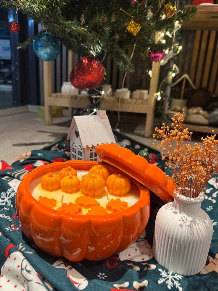 Turuncu kabak şeklinde renkli bir mum, çıkarılabilir kapaklıdır. Mum yüzeyinde küçük kabak ve yaprak süslemeleri bulunur. Mevsimlik dekor için uygundur. ️