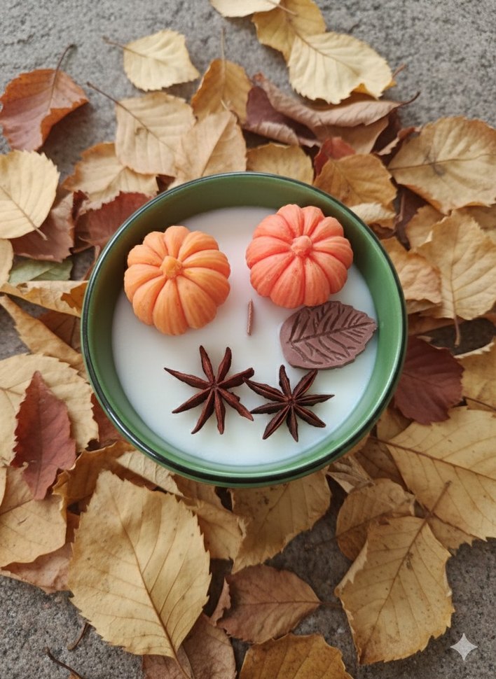 Turuncu kabak ve yaprak süslemeli mum, üzerinde yıldız anason baharatları bulunur. Sonbahar yaprakları arasında yer alır. ️