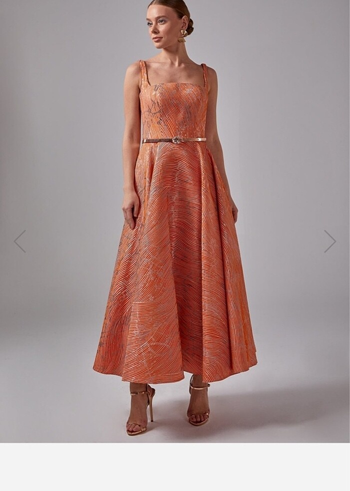 Turuncu kabartma kumaşlı midi maxi abiye