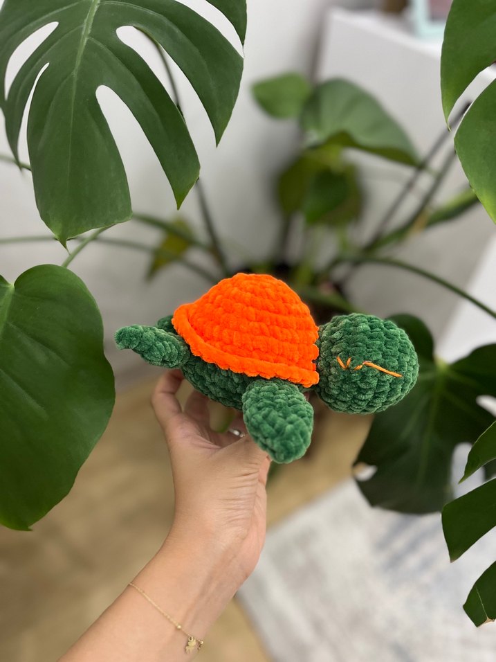 Turuncu kabuklu, yeşil gövdeli yumuşak ve renkli peluş kaplumbağa oyuncak İstenilen renkte sipariş alabilirim