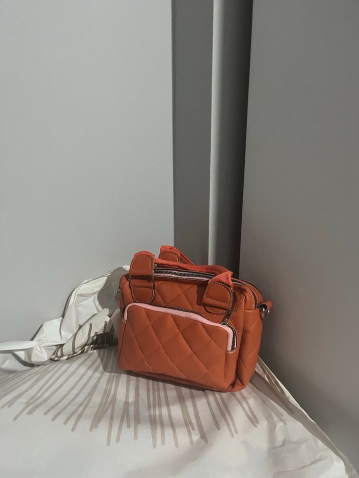 Kahverengi, kemerli ve yumuşak sentetik kumaştan yapılmış kadın el çantası. Minimalist ve çağdaş tasarımıyla günlük kullanıma uygun, desensiz ve açık renk.