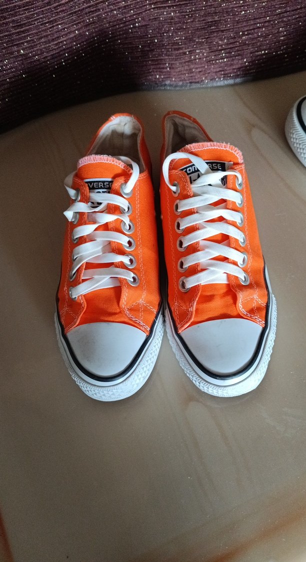 Turuncu kadın spor ayakkabılar, kauçuk taban ve ince topuklu tasarımıyla günlük kullanıma uygun, sade ve renkli bir görünüme sahiptir.
