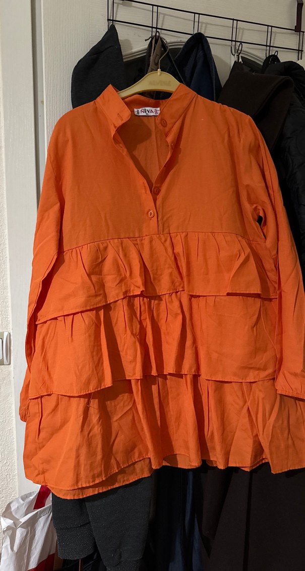 Uzun kollu, yüksek yakalı hamile bluzu, yumuşak keten kumaştan, parlak turuncu renkte ve kat kat fırfırlı, rahat bohem tarzda.
