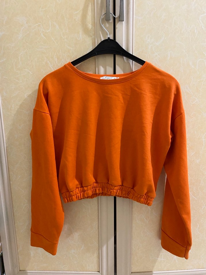 Dar kesim, uzun kollu hamile gömleği, turuncu parlak süet kumaştan. Bisiklet yaka ve fermuar detaylı, baskılı desenli, günlük sokak stiline uygun.
