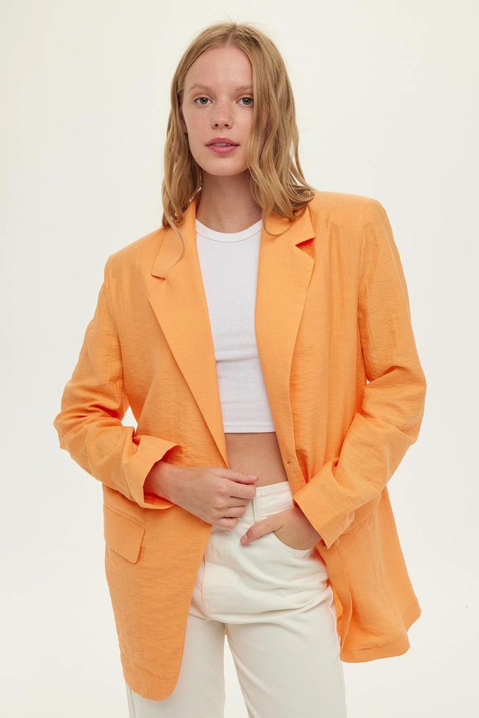 Turuncu renginde, keten kumaştan, düğmeli, uzun kollu ve normal boyda bol kesim kadın ceket.