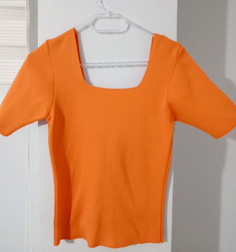 Kısa kollu, tek renk ve tekne yaka kadın bluz. Sentetik kumaştan, pastel turuncu renkte, günlük kullanım için uygun.