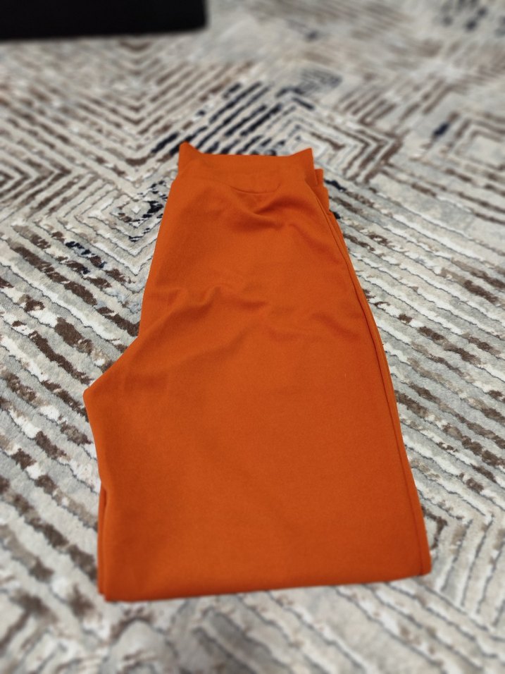 Uzun paçalı, rahat kesim kadına özel sentetik kumaştan yapılmış turuncu pantolon. Düz ve renkli tasarımıyla günlük sokak stiline uygun, rahat ve şık görünüyor. üçlü olarak satışta