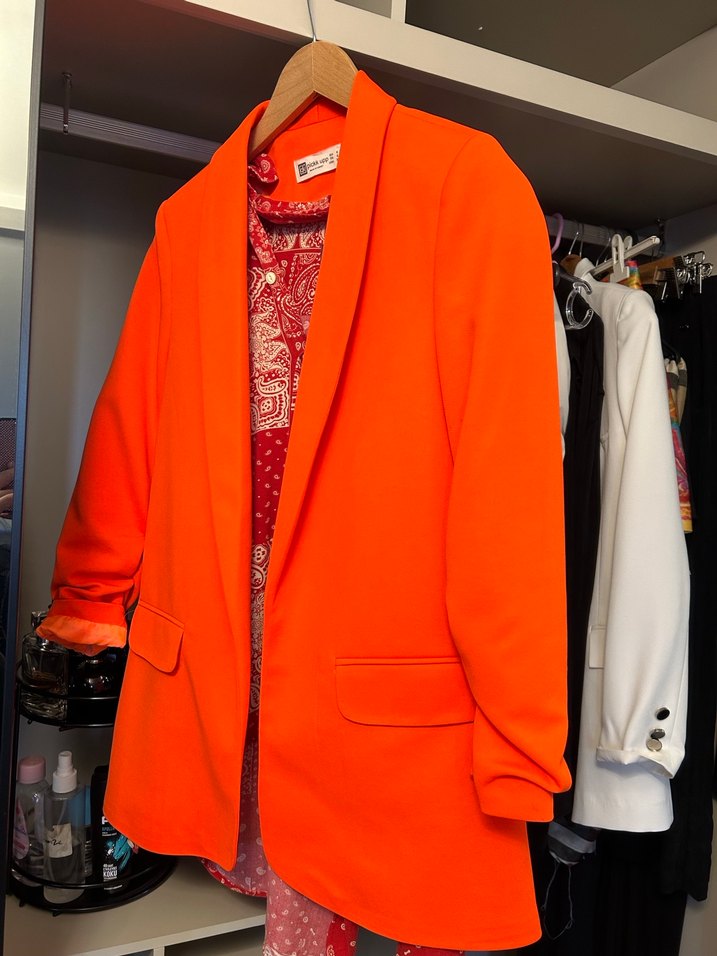 Turuncu renkli, düğmeli, uzun kollu kadın blazer. Normal kesim ve midi boyda, yumuşak ve sıcak dokulu kumaştan üretilmiştir.