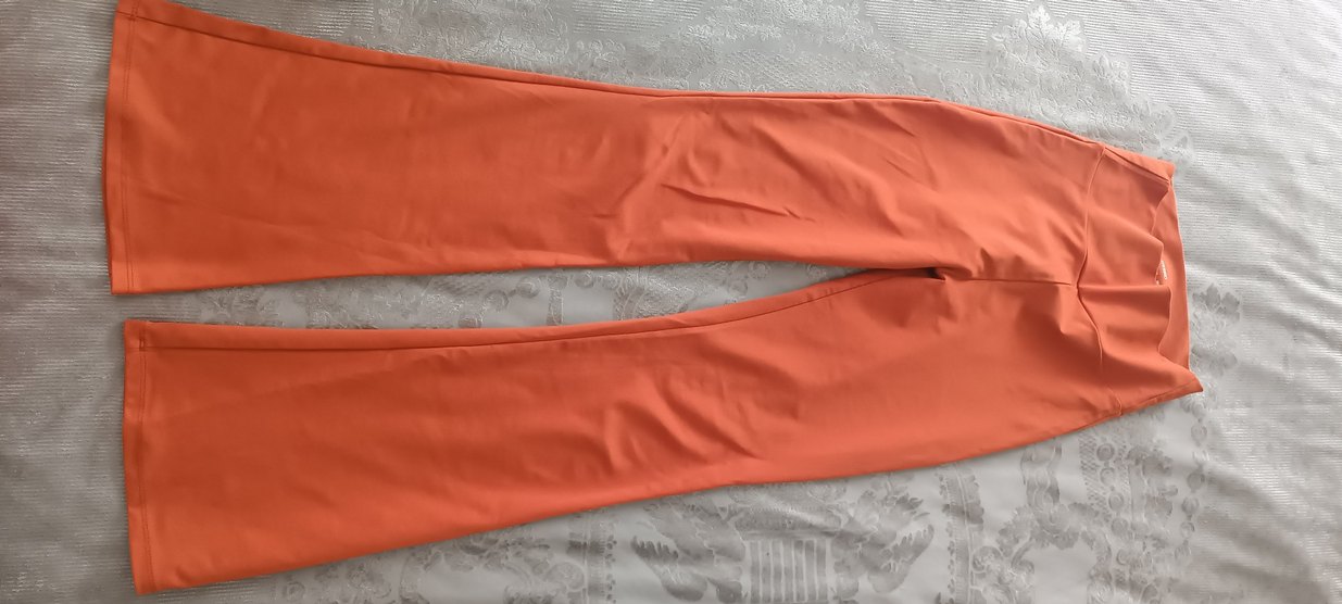 Yumuşak sentetik kumaştan yapılmış, drapeli turuncu kadın midi boy, dar kesim pantolon, açık hava için uygun.