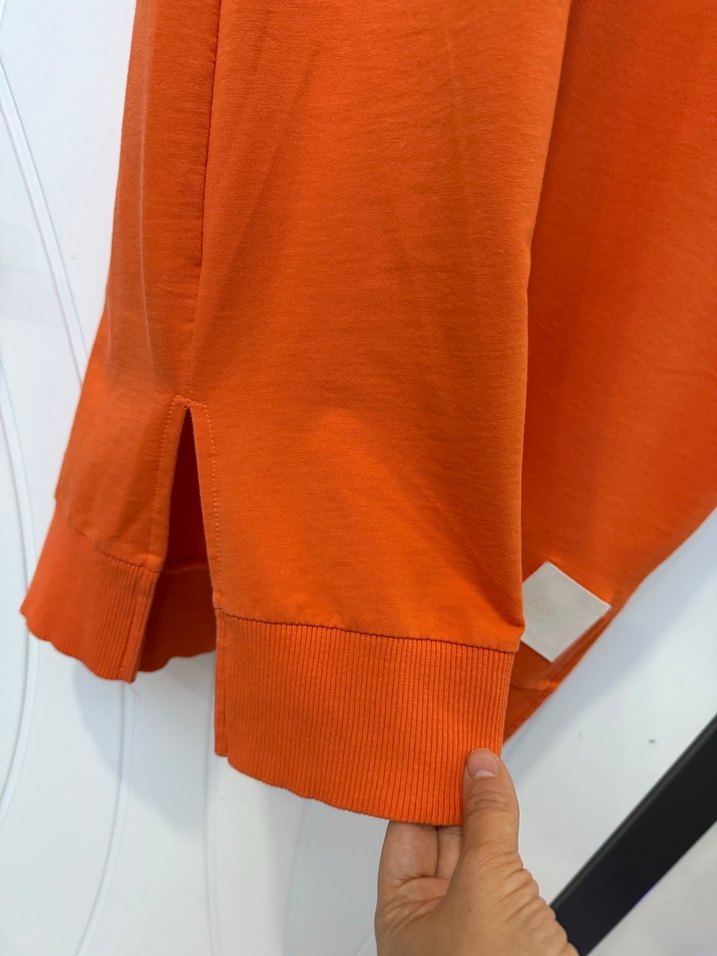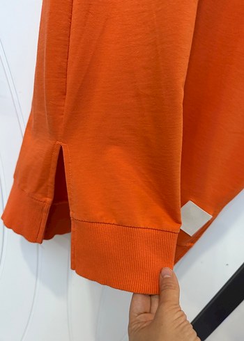 Turuncu renkli kadın sweatshirt, yuvarlak yaka ve uzun kolludur. Salaş kesimi ve yan yırtmaç detayıyla midi boyda, parlak sentetik kumaştan üretilmiştir.