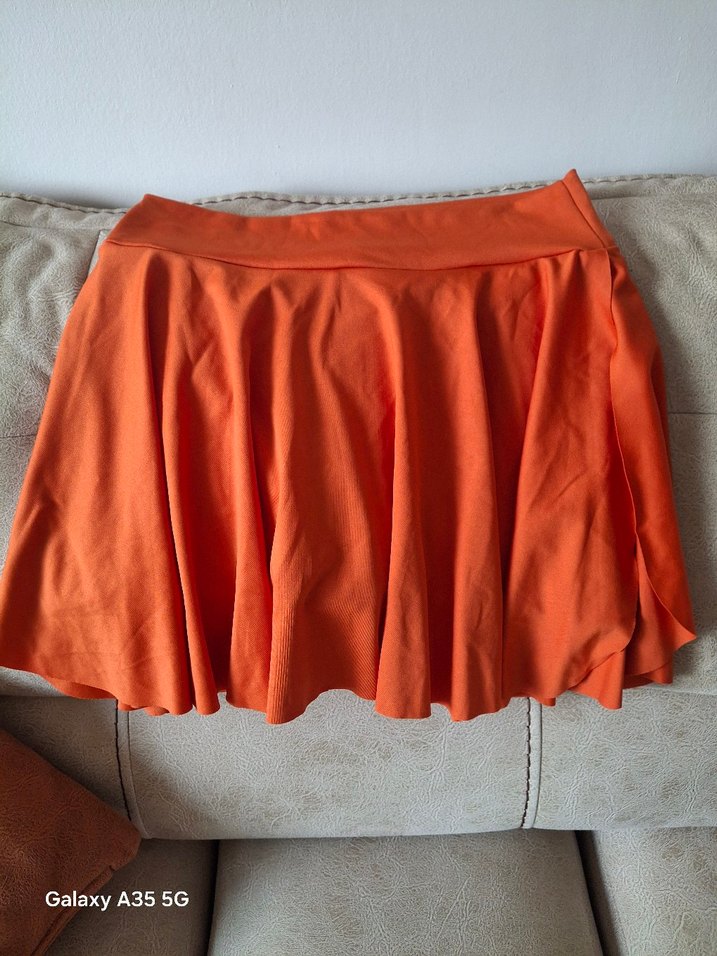 Bu kadın mini etek, pilili ve fitted kesime sahip, parlak turuncu renkte sentetik kumaştan yapılmıştır. Düz, altı sort. kesinlikle hiç kullanılmadı.