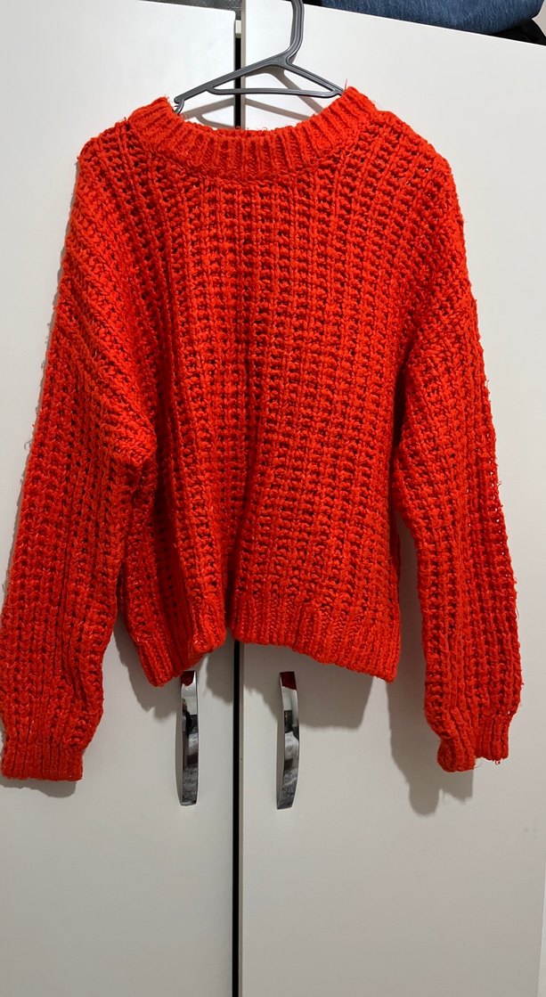 Turuncu renkli, örgü kumaştan, uzun kollu ve yuvarlak yaka, bol kesim kadın kazak. Rahat ve gündelik kullanıma uygun sade tasarım.