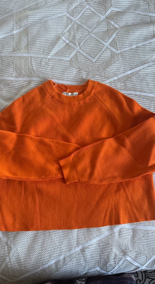 1 kere giyildi Turuncu, örgü yünden, uzun kollu, yuvarlak yakalı, bol kesim kadın kazak. Boyum 163 bel hizasında, Rahat ve gündelik kullanıma uygun.