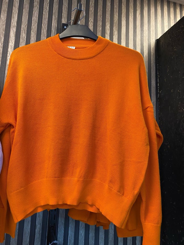 Turuncu renkli, yuvarlak yaka ve uzun kollu kadın kazak. Örgü yün malzemeden, rahat ve salaş kesim. Günlük kullanıma uygun midi uzunlukta.
