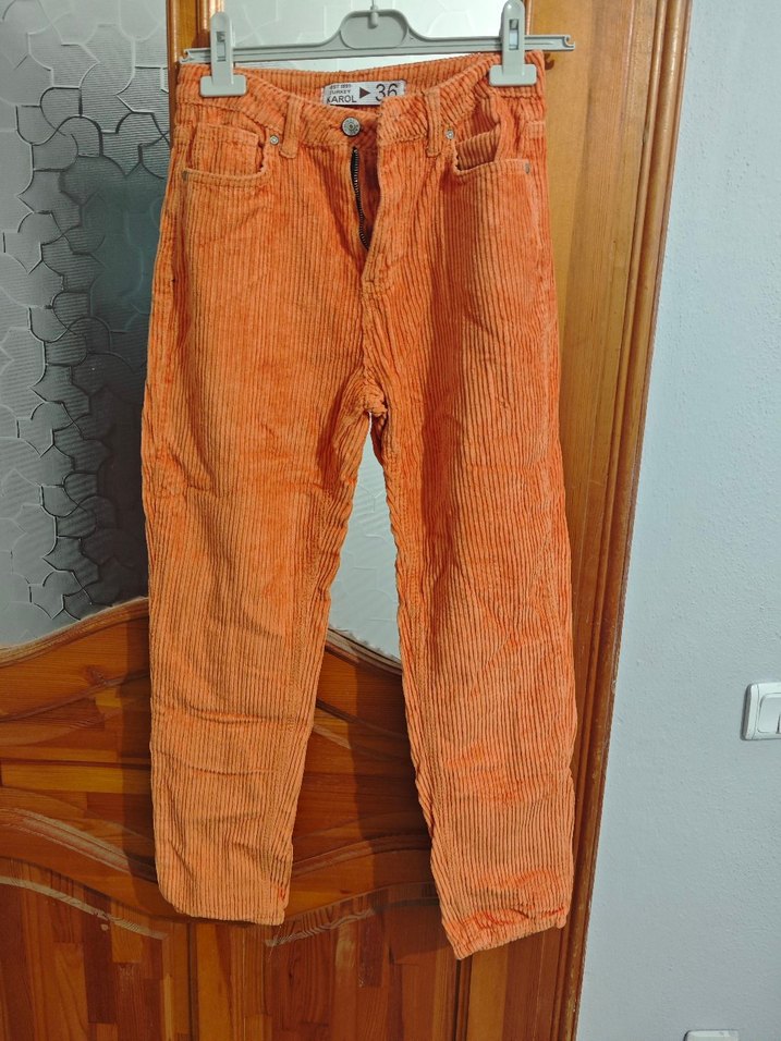 Turuncu pastel renkte, düğmeli, %100 pamuk kumaştan kadın pantolon.