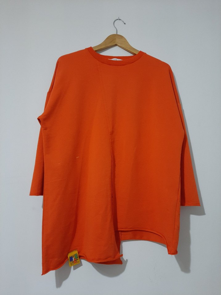 Turuncu renkte, uzun kollu ve salaş kesime sahip kadın sweatshirtü. Yumuşak ve sıcak kumaştan üretilmiş, yuvarlak yaka ve midi boyda. Günlük sokak stili için uygun, sade ve renkli tasarım. Sayılı kez kullanıldı yeni ürün fakat bir kaç yerinde lekeler mevcut fotoğraflarda görüldüğü gibi kullanıma engel değil göğüs ölçüsü 62 cm boy ölçüsü 80 cm