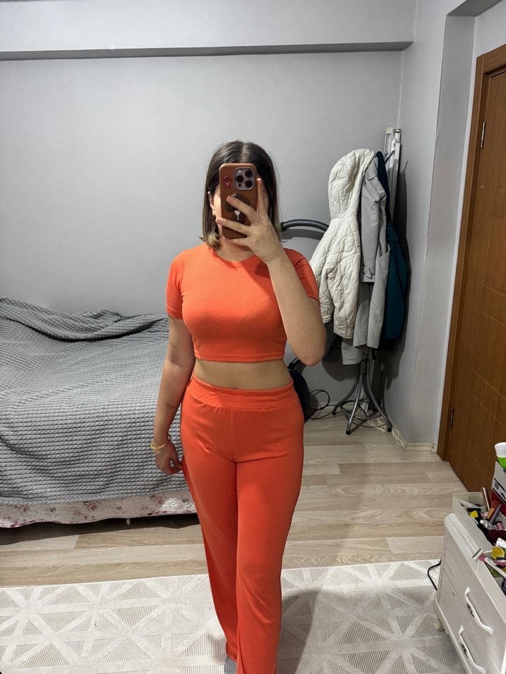 Yarım kollu, yüksek yakalı turuncu kadın spor takımı, hafif sentetik kumaştan, midi boyda ve rahat şık tasarıma sahiptir.