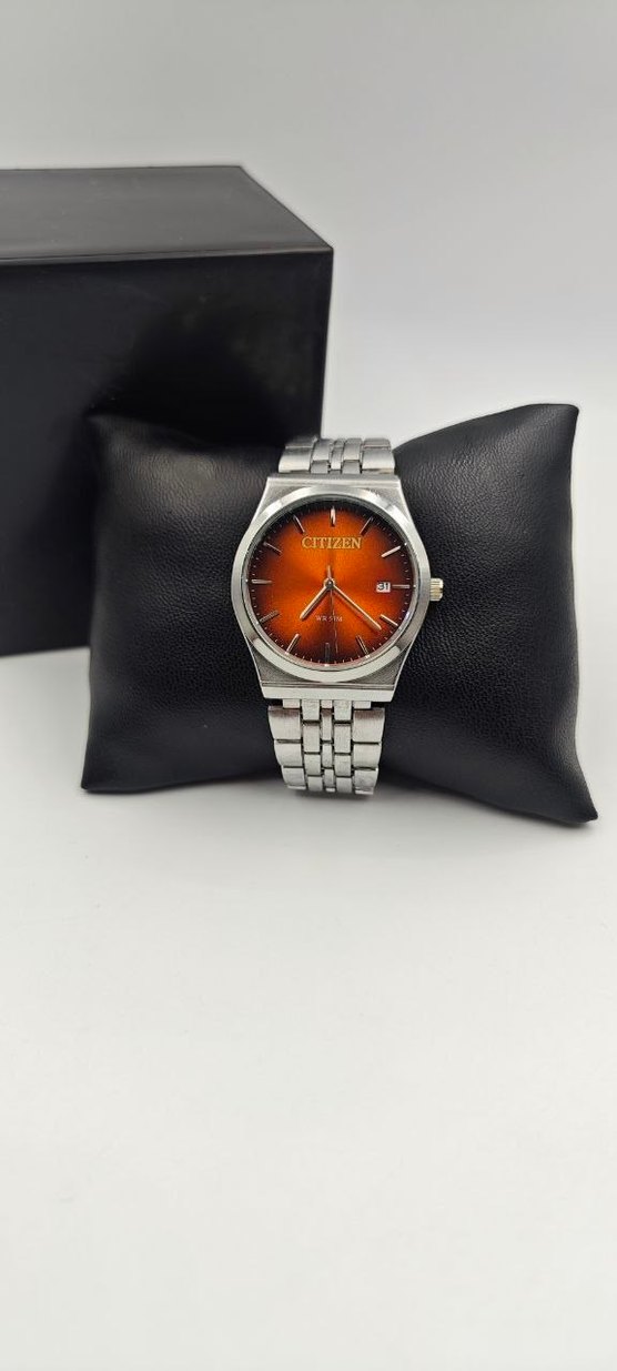 Citizen marka, turuncu kadranlı erkek kol saati. Gümüş renk metal kayış ve tarih göstergesi bulunur. Klasik ve çağdaş tasarım.