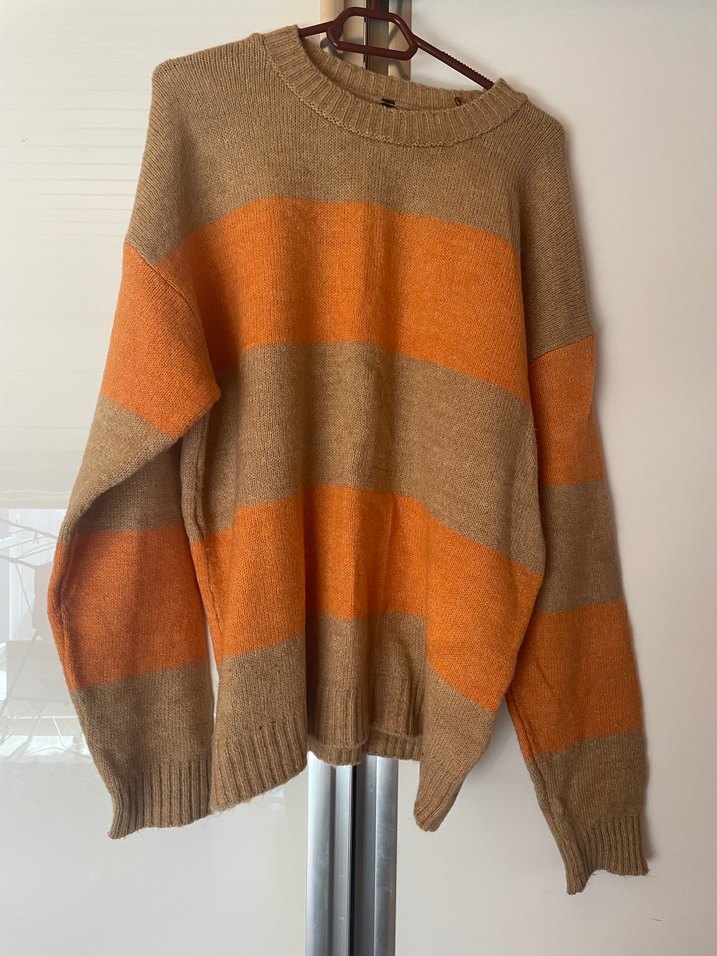 Geniş turuncu ve kahverengi çizgili, uzun kollu, yuvarlak yakalı, bol kesim örgü kazak. Midi boyda, rahat ve günlük kullanım için uygun. Muhtemelen orj bi markanın kazağı aldığımda etiketleri kesilmişti bu yüzden bedeninide bilmiyprum fakat ben 42 bedenken kullandım.toplamda 4 kez kullanılmıştır