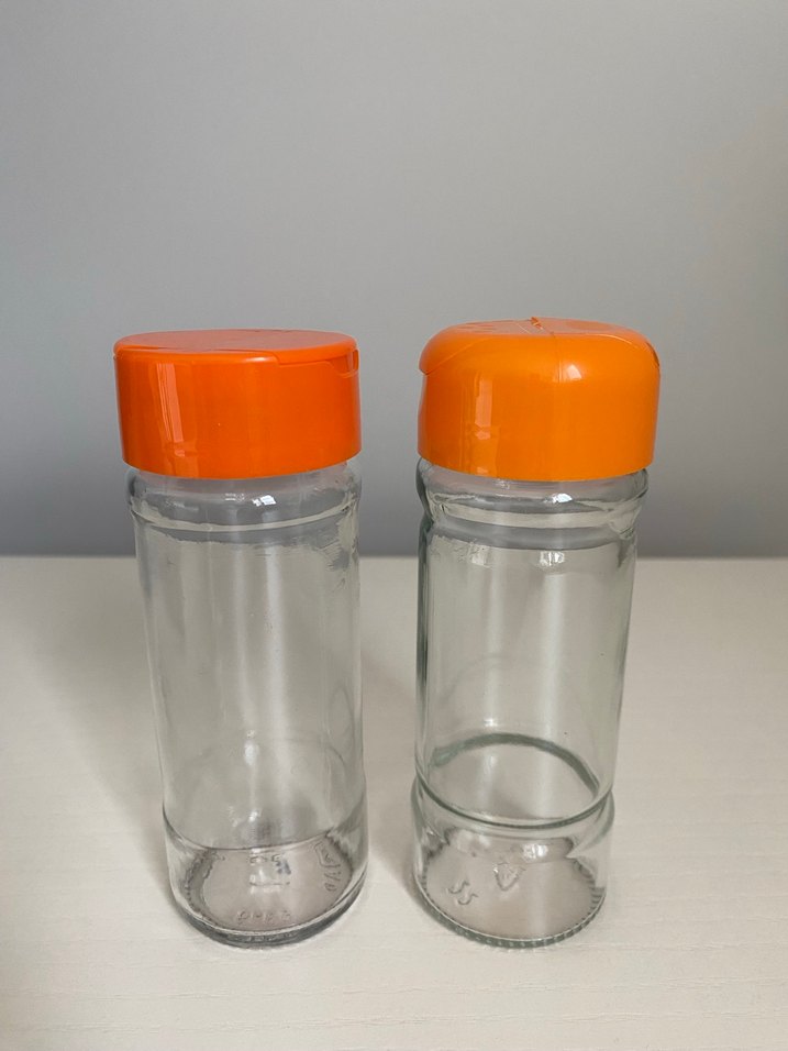 İki adet turuncu kapaklı, şeffaf cam baharat kavanozu. Farklı kapak tasarımlarıyla mutfakta baharat saklamak için uygundur. ️