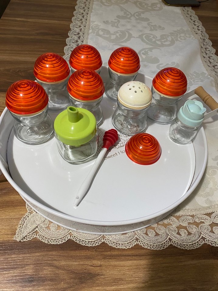 7 adet Turuncu kapaklı cam baharatlıklar ve içeren set, farklı kapak seçenekleriyle baharatlarınızı düzenler 1 adet şekerlik 1 adet bal kaşığı 1 adet tuzluk