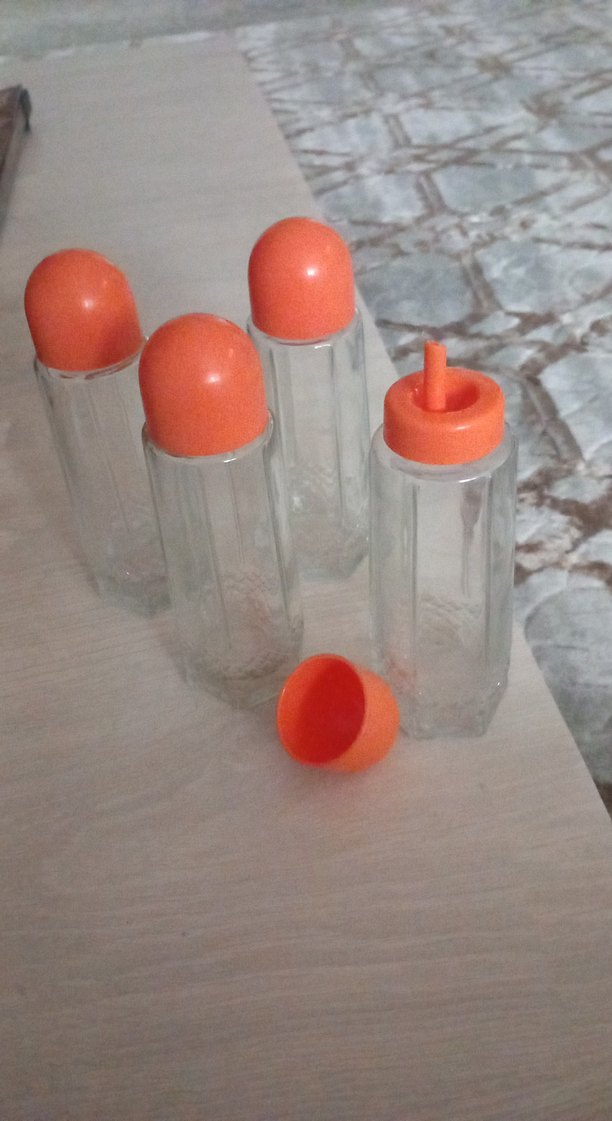 Parlak turuncu kapaklı,sosluk,sirke ,yağlık için çok amaçlı cam şişe 3 adet var.Hiç kullanılmadılar