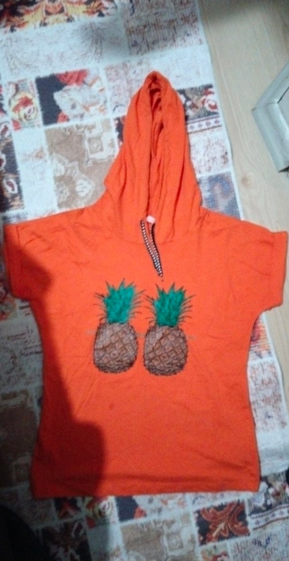 Turuncu kapüşonlu, kısa kollu, bol kesim sweatshirt, renkli ananas baskısı ve püskül detayları ile yumuşak ve sıcak kumaştan.