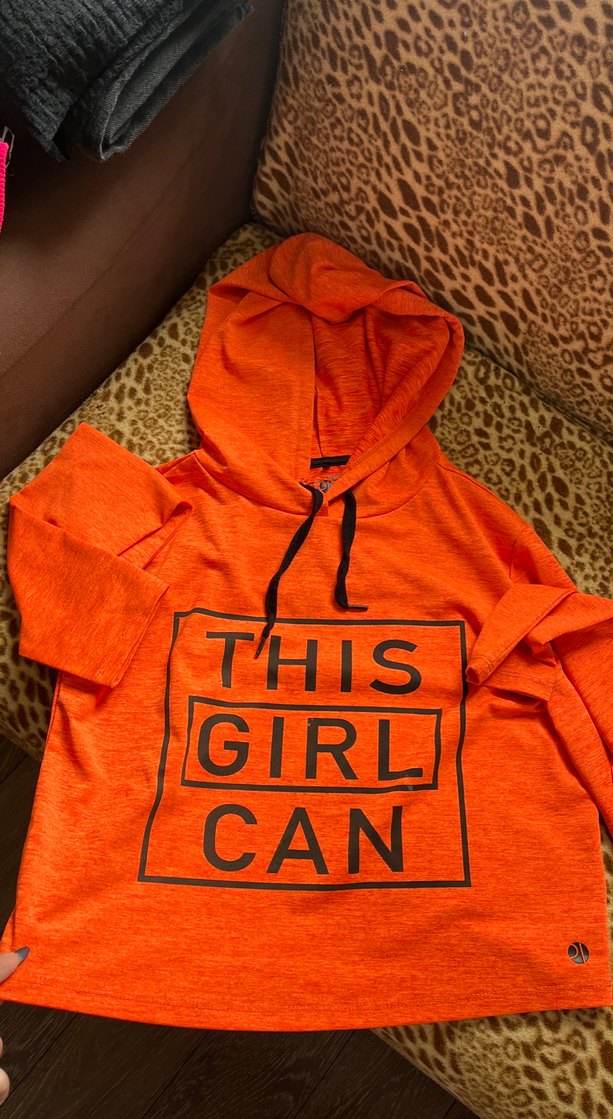 Turuncu kapüşonlu, uzun kollu, bol kesim kadın sweatshirt. Üzerinde 'CAN THIS GIRL' renkli baskı bulunur. Örgü görünümlü sentetik kumaştan yapılmıştır.