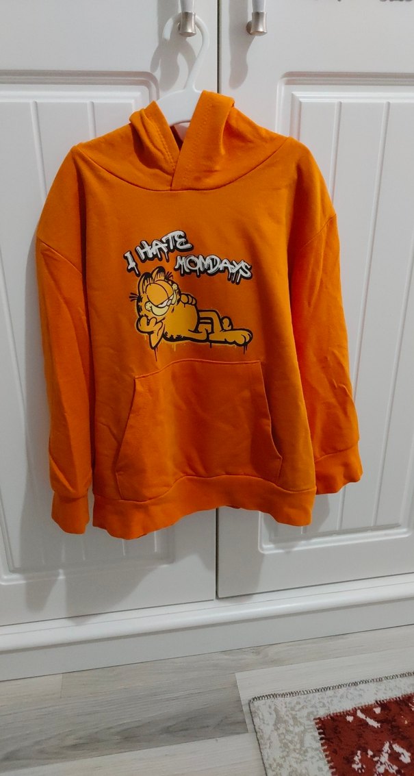 Turuncu kapüşonlu sweatshirt, uzun kollu ve bol kesimdir. Yumuşak kumaştan yapılmış olup, Rahat bir günlük tarza uygundur.
