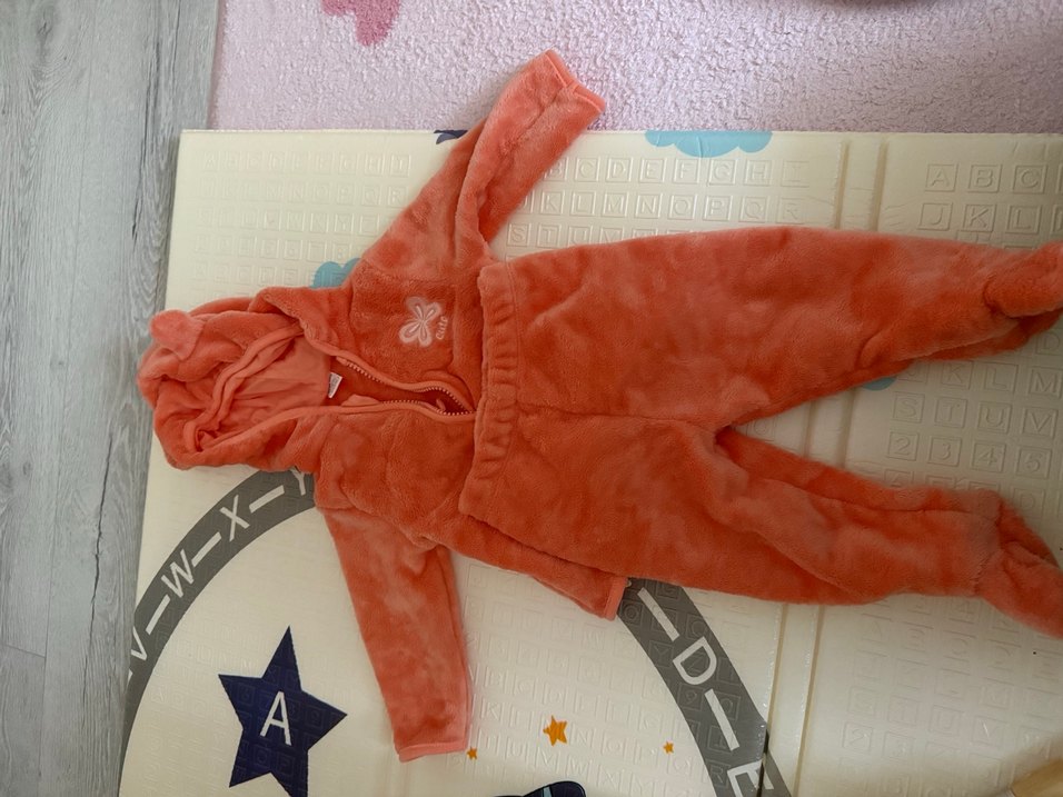 Renkli turuncu bebek tulumu, kapüşonlu ve yumuşak kürk detaylıdır. Fermuarlı ve desensiz sade tasarıma sahiptir. Çok az kullanıldı deforme yok