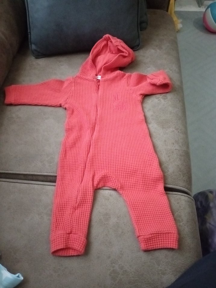 Canlı turuncu renkte, kapüşonlu ve uzun kollu bebek tulumu. Kolay giydirme için fermuarlı tasarım.
