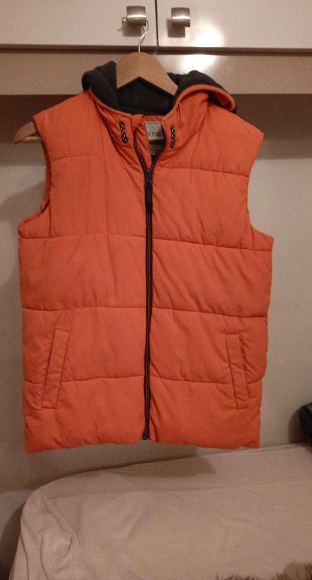 Koyu turuncu renkte, yüksek yakalı ve fermuarlı çocuk yeleği. Yumuşak ve sıcak kumaştan, dar kesimli ve sokak stili.