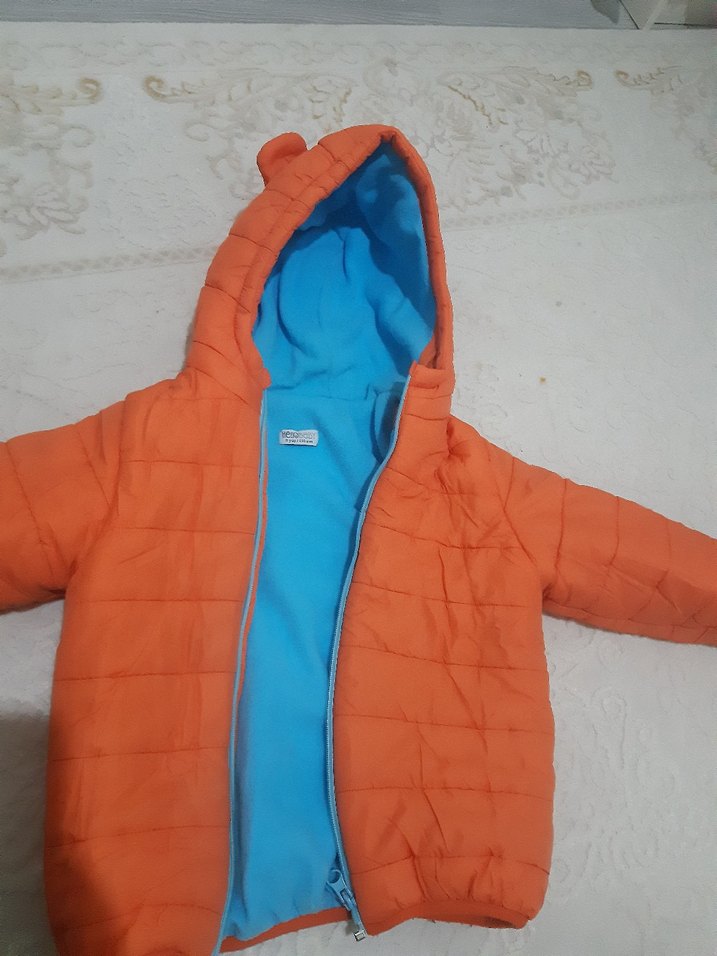 Fermuarlı ve kapüşonlu, turuncu dış yüzeyli ve yumuşak mavi astarlı, dar kesim erkek çocuk montu. Sokak stiline uygun.