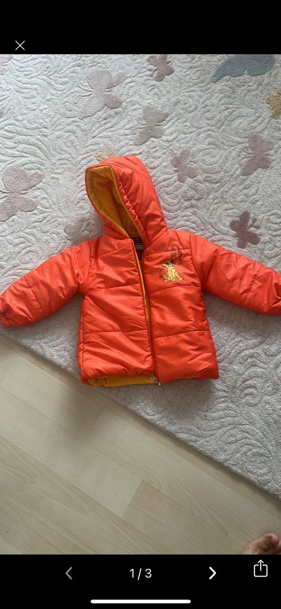 Turuncu renkli, kapüşonlu ve fermuarlı erkek çocuk montu. Yumuşak ve sıcak kumaştan üretilmiştir, günlük rahat kullanıma uygundur. Hediye geldi zevkime uymadığı için satıyorum 3 yaş