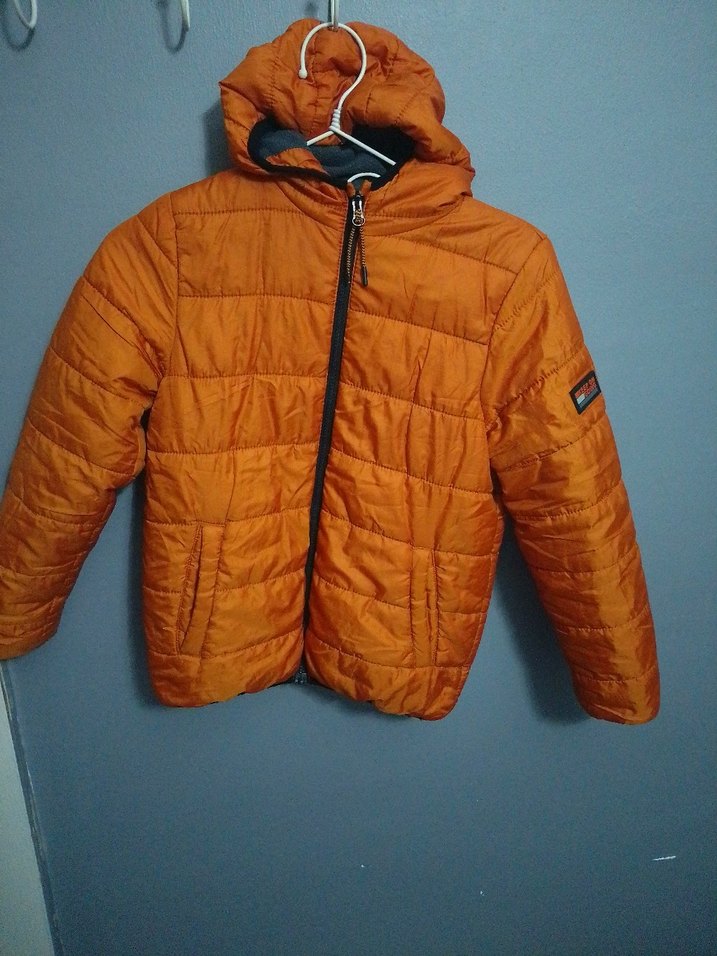 Turuncu renkli, kapüşonlu, fermuarlı ve yumuşak dokulu kumaştan üretilmiş erkek çocuk montu. Trend sokak giyimi için uygun.