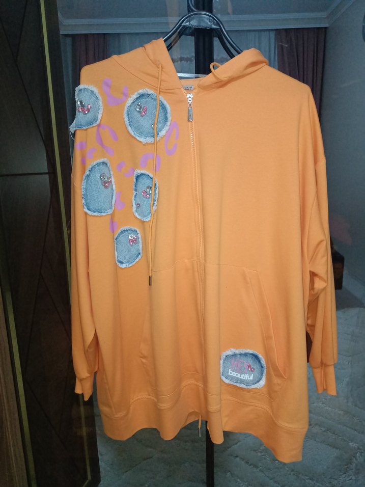 Turuncu renkli, uzun kollu, fermuarlı ve kısa kesim sweatshirt. Salaş kesimi ve baskılı renkli detaylarıyla sokak stiline uygun rahat bir parça. eşofman altı birlikte