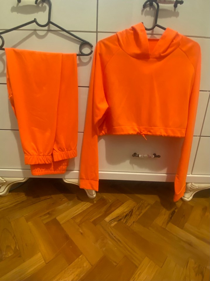 Kadınlar için parlak turuncu renkte, kapüşonlu, uzun kollu ve kısa kesim, düz desenli, rahat ve sıcak kumaştan mini eşofman takımı. Spor ve günlük kullanım için uygundur.