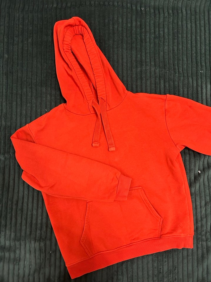 Turuncu kapüşonlu sweatshirt, uzun kollu ve rahat kesimlidir. Yumuşak ve sıcak kumaştan yapılmıştır, gündelik kullanıma uygundur.